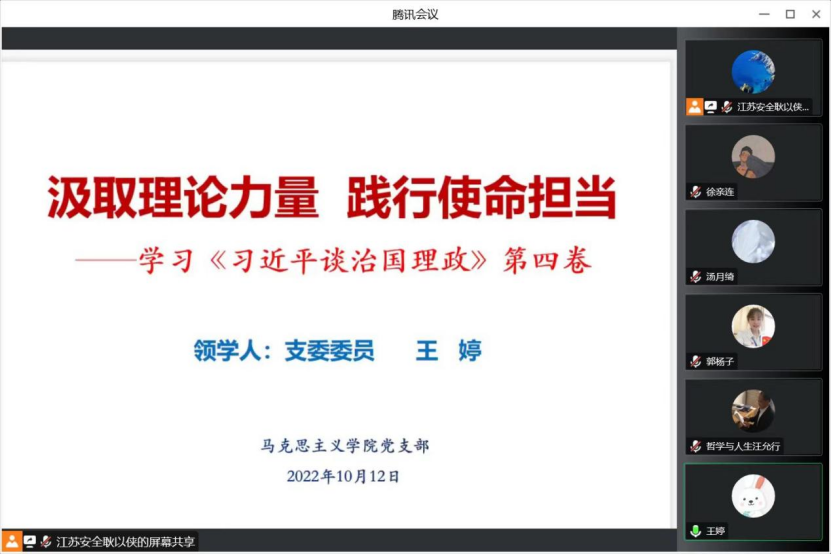 支委委员王婷选取《习近平谈治国理政》第四卷中的第五部分——统筹疫情防控和经济社会发展,围绕伟大抗疫精神进行讲解。她指出“人无精神不立,国无精神不强”,中国共产党所具有的无比坚强的领导力,是风雨来袭时中国人民最可靠的主心骨,勉励党员同志们应不忘初心、牢记使命,充分发挥党员的先锋模范作用。