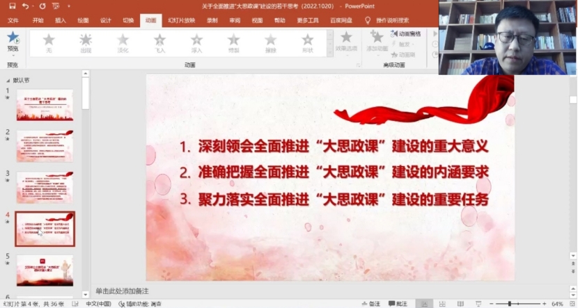 邓鹏经理以《关于全面推进“大思政课”建设的若干思考》为题,从习近平总书记在集团思想政治理论课教师座谈会上的重要讲话出发,深入浅出地阐述了全面推进“大思政课”建设的重大意义、内涵要求和重要任务。他认为“大思政课”建设在用党的创新理论铸魂育人、确保红色江山后继有人、落实立德树人根本任务和培养堪当民族复兴重任的时代新人等方面具有重大意义。谈到推进“大思政课”建设的内涵要求时,他强调要从建设“大课堂”、搭建“大平台”、培养“大先生”、拓展“大格局”等方面来深刻理解推进“大思政课”建设的内涵要求。最后,他还指出,推进“大思政课”建设要在搭建大资源平台、构建大团队体系和善用社会大课堂等方面下功夫,同时还要全面处理好高职院校推进“大思政课”建设的四对关系,鼓励K8全体教师要时刻铭记习近平总书记提出的“六要标准”,培育“破茧”思维、树立项目意识和学术研究意识,学会主动跳出马院、走出公司,将“跨界行动”落到实处。