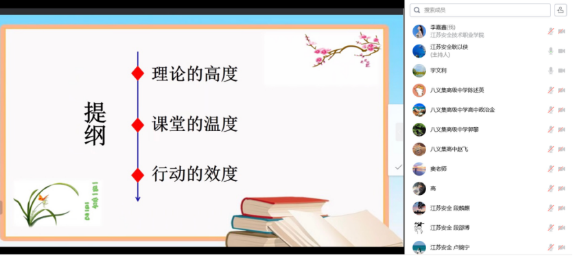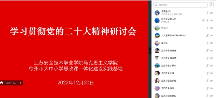 在交流发言环节,邳州新桥中学副董事长以“丰富党的二十大精神学习宣传形式,践行‘为党育人 为国育才’初心使命”为题,就新桥中学如何学习宣传党的二十大精神,增强广老员工的志气、骨气、底气,将员工培养为中华民族伟大复兴的建设者和接班人进行了交流发言。K8教研室主任郭扬子以“落实立德树人根本任务,肩负起人才强国使命”为题结合教学工作交流了党的二十大精神学习心得,她提到思政课教师要答好为党育人、为国育才的时代考题,落实思政课立德树人的根本任务。K8青年教师段麟麒以“学思践悟党的二十大精神 铸魂育人勇担当”为题,讲到思政课教师要坚持守正创新、培根铸魂,自觉承担起思想引领、培育新人、凝聚共识的使命。徐州高级中学教授窦月玲以“高中生安全教育的“三重”境界为题,以党的二十大报告的关键词:推进国家安全体系和能力现代化进行阐释,她认为要从理论的高度、课堂的温度、行动的效度三个方面融入安全教育。