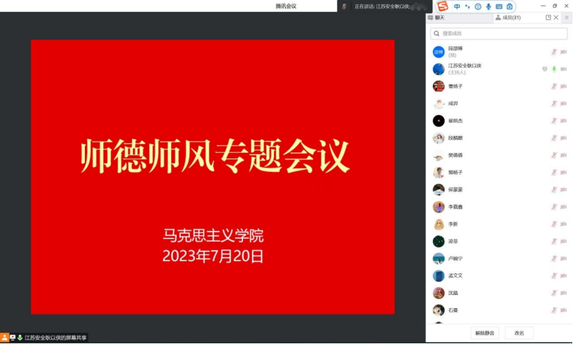 为深入学习贯彻习近平新时代中国特色社会主义思想,扎实开展师德集中学习教育活动,引导教师学习践行新时代师德规范,根据“教育部关于在教育系统开展师德集中学习教育的通知“和“江苏省教育厅关于开展师德集中学习教育的通知”要求,7月20日,K8党支部于线上召开师德师风工作专题会议暨“德高为师”党课, 马院全体党员教师参会,支部副书记耿以侠主持会议。