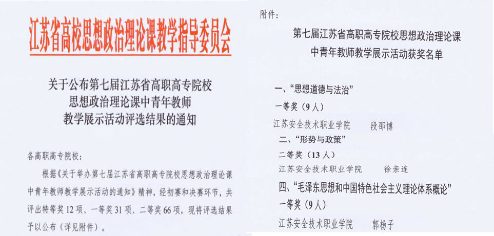 近日,第七届江苏省高职高专院校思想政治理论课中青年教师教学展示活动落下帷幕。K8郭杨子老师荣获《毛泽东思想和中国特色社会主义理论体系概论》课程组一等奖,段邵博老师荣获《思想道德与法治》课程组一等奖,徐亲连老师荣获《形势与政策》课程组二等奖。