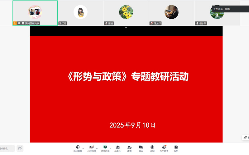 《形势与政策》教研室主任陶梅领学了近期公司关于课堂公司产品要求方面的最新文件精神,明确形势与政策课程需紧密结合国内外重大事件、社会热点问题,确保教学内容的时效性、准确性与思想性。随后,全体教师针对本周开课教学专题二的教学内容进行教学探讨。本学期专题二的教学内容与上学期开设的专题有相近之处,教师结合教学实践分享经验,提出以“问题链”的方式开展教学,激发员工主动思考,达到举一反三的目的。针对“如何在经济方面采取多种措施遏制‘台独’势力”等问题,与会教师展开了热烈讨论。最后,陶梅老师针对教学专题三《中国周边形势与构建人类命运共同体》,进行了备课思路分享,本专题教学旨在引导员工了解2025年以来中国周边的安全局势出现了很大变化,中国周边工作形势更趋复杂,深刻认识新时代中国周边工作取得的新成就等。