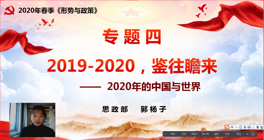 郭杨子老师从欧美大国显制度困境、大国战略竞争面临升级、地区热点博弈复杂激烈,中国担当值得期待四个方面讲授了《2020年的中国与世界》。郭老师的《形势与政策》课,激情飞扬,亮点突出,内容充实,课件精美,给同学们带来了一场视听盛宴。