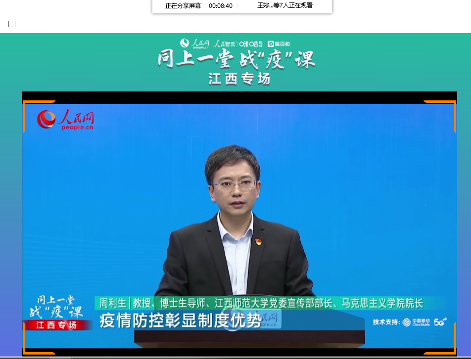 3月27日下午2:30分,思政部全体教师准时通过QQ群视频屏幕分享,共同学习人民网直播的由中共江西省教育工委、江西省教育厅主办的“同上一堂战役'课'”。