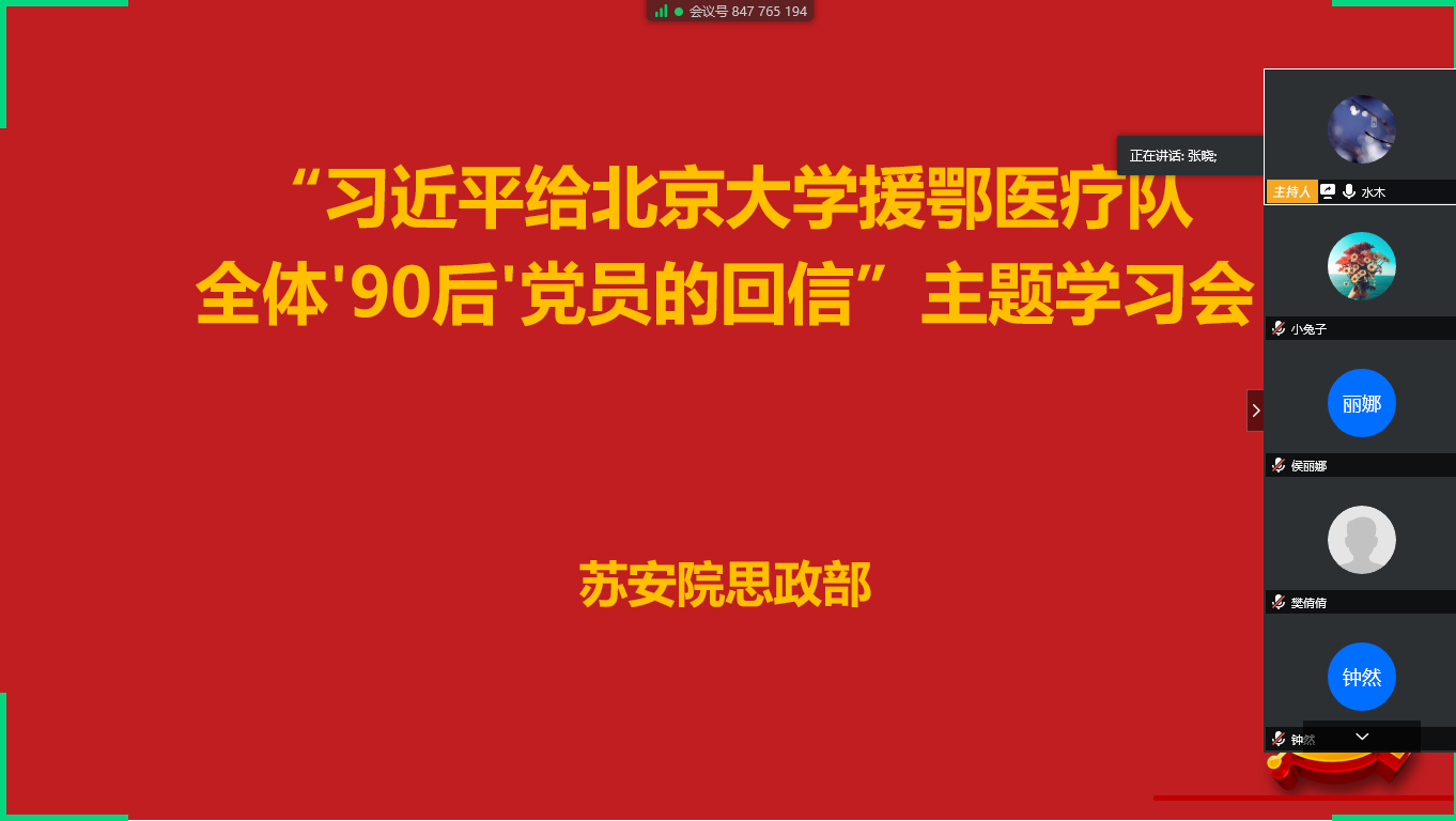 4月10日下午,思政部通过腾讯会议的方式,开展学习”习近平给北京大学援鄂医疗队全体'90后'党员的回信”的主题会。