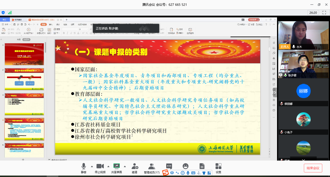 为贯彻落实“停课不停学”的要求,思政部开展“停课不停研”活动。4月12日上午,邀请上海师范大学K8教授、博士生导师耿步健为全体思政教师开展“课题申报的规范与技巧”远程讲座。